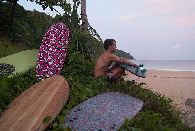 Sarongs from all over Sth East Asia adorn his boards, fitting snugly over the custom designs he and the new owner collaborate over. Arresting veneers of sustainable Paulownia wood cover the decks, stunning testimonies to the eternal and sublime beauty of the forest. So, not only do you get to ride a work of art on a wave that is a work of nature, but you get to be involved in the design process. There’s no cloak and dagger stuff going on here, no hidden method that has to be protected lest it is stolen by people with less vision. It’s an organic free-for-all. The only constraints are the need for the sculpture to glide through the water like it is a part of it.