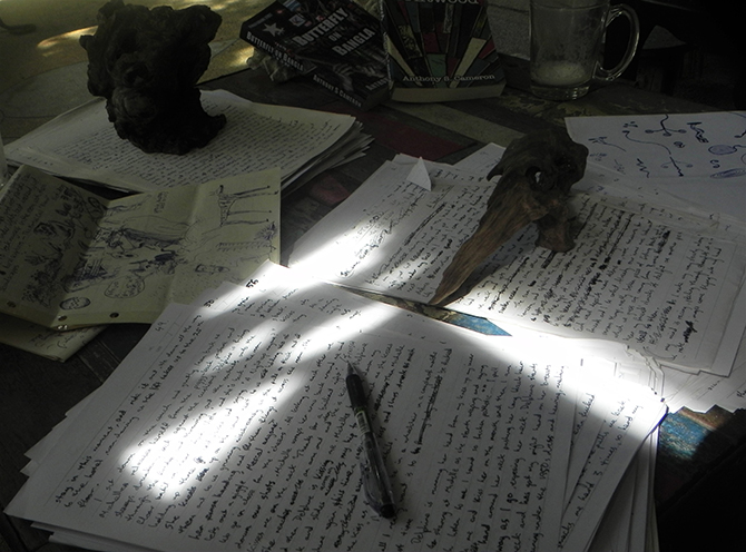 I have written close to half a million words in the last five years, and most of them have involved ink landing on paper. That’s right people, these neatly ordered words you are reading now started their brief life as scratchings on a coffee stained piece of paper. With these short pieces for the astonishingly brilliant Trouble magazine, the scratchings aren’t much more than a few key words, maybe a phrase to get things rolling and the obligatory doodle. Then I get the laptop out and fire away until the words run out or the idea I was chasing trips and stumbles or simply comes to a natural conclusion. With the novels, the whole bloody thing gets scratched feverishly into paper, surrounded by detailed doodles, notes in the margins, underlinings, biscuit crumbs and the ubiquitous rogue grey hairs that cascade off my body with alarming regularity.