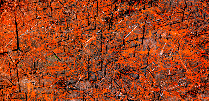 John Gollings, ‘877.00M E 145˚ 12’ 31.12’ S 037˚ 25’ 15.95’’ 2009, pigment dye, inkjet print on hahnemuhle photo rag paper, image 110 x 165 cm, paper 130 x 185 cm. Courtesy of the artist. Collection: McClelland Sculpture Park+Gallery. Donated through the Australian Government’s Cultural Gifts Program by John Gollings © John Gollings. ‘Aftermath: Landscape Photographs by John Gollings From Black Saturday’, Fremantle Arts Centre, 1 Finnerty Street, Fremantle (WA), until 26 July